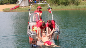 Bei der Absicherung des Ironman Kraichgau unterstützt uns die DLRG Durlach mit ihrem Motorrettungsboot. Dadurch besteht für uns die Möglichkeit dieses zu fahren und nochmal anzuschauen. Außerdem können wir praktisch testen, wie viel einfacher und schonender die Personenaufnahme mit einem solchen Boot mit Bugklappe ist.