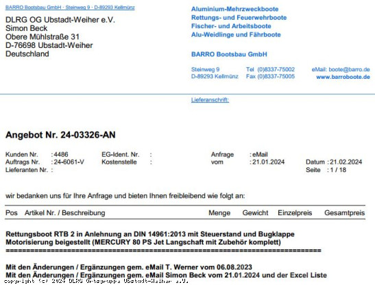 Aufgrund der aktuell beginnenden Haushaltsplanungen für das Jahr 2024 der Gemeinde Ubstadt-Weiher wird bei dieser um Unterstützung für die geplante Ersatzbeschaffung des Motorrettungsbootes gebeten und ein erstes Angebot zur Kenntnis eines groben preislichen Rahmens geschickt. ... Mehr erfahren
