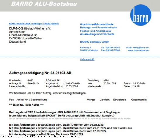 Die auf der heutigen Mitgliederversammlung gewählte Vorstandschaft beschließt direkt im Anschluss an die Versammlung die Auftragsvergabe des Bootsbaus an die Firma BARRO, so wie es bei den Berichten im Rahmen der Mitgliederversammlung zuvor vorgestellt wurde. Die Kosten werden sich auf 70.000€ bis 75.000€ belaufen. Die Lieferzeit beträgt voraussichtlich rund 9 Monate. Namensvorschläge für das neue Boot dürfen gerne an einsatz@ubstadt-weiher.dlrg.de gesendet werden. ... Mehr erfahren