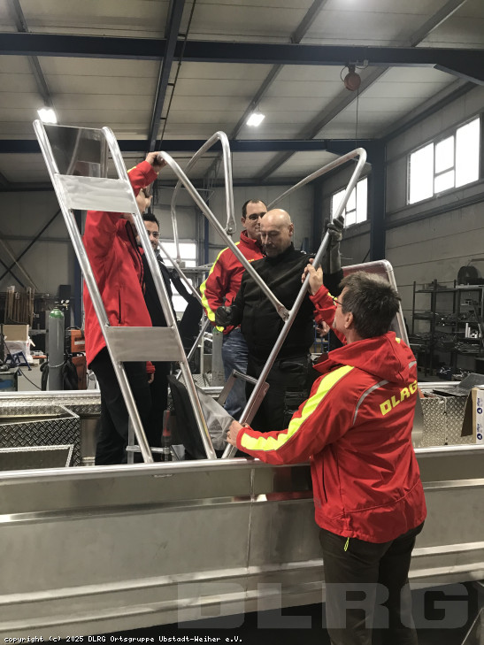 Bereits gut zwei Wochen nach Baubeginn unseres Motorrettungsbootes konnten vier Mitglieder der Projektgruppe zum Boothersteller BARRO zur Zwischenbauabnahme fahren. Gemeinsam mit dem Geschäftsführer und dem ausführenden Metallbauer von BARRO wurde die genaue Position der Aufbauten sowie Feinheiten bei deren Ausführungen besprochen. Außerdem wurde überlegt, wo der beste Ort für die Montage des Leuchtenträgers ist. An diesem ist nicht nur die bei Nacht oder schlechter Sicht notwendigen Positionsbeleuchtung, sondern auch das Gestänge für das sogenannte Biminitop angebracht. Ein Biminitop ist ein ausklappbares Sonnensegel, das den Einsatzkräften Schatten spendet. Schließlich sind unsere DLRG-Retter vor allem im Sommer und bei Sonnenschein auf dem Motorrettungsboot unterwegs und damit besonders ... Mehr erfahren